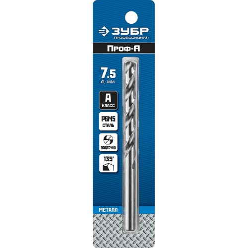 Сверло ЗУБР 29625-7.5, предназначено для обработки легированных и углеродистых сталей с пределом прочности до 900 Н/мм², цветных металлов, серого чугуна и пластмассы. Качественное и точное сверло с большим ресурсом. Сверло изготовлено методом шлифования профиля по ГОСТ 10902-77 и соответствует классу точности сверления "А1". Крестообразная подточка позволяет начать сверлить без предварительного кернения. Угол заточки при вершине равный 135° повышает производительность работ.