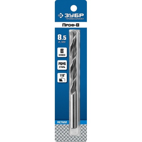 Сверло ЗУБР 29621-8.5, предназначено для обработки легированных и углеродистых сталей с пределом прочности до 900 Н/мм², цветных металлов, серого чугуна и пластмассы. Качественное сверло с высоким ресурсом. Изготовлено методом винтового проката по ГОСТ 10902-77 и соответствует классу точности "В". Угол заточки 118 градусов позволяет обрабатывать легированные и углеродистые стали.