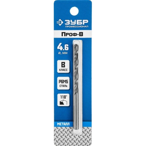 Сверло ЗУБР 29621-4.6, предназначено для обработки легированных и углеродистых сталей с пределом прочности до 900 Н/мм², цветных металлов, серого чугуна и пластмассы. Качественное сверло с высоким ресурсом. Изготовлено методом винтового проката по ГОСТ 10902-77 и соответствует классу точности "В". Угол заточки 118 градусов позволяет обрабатывать легированные и углеродистые стали.
