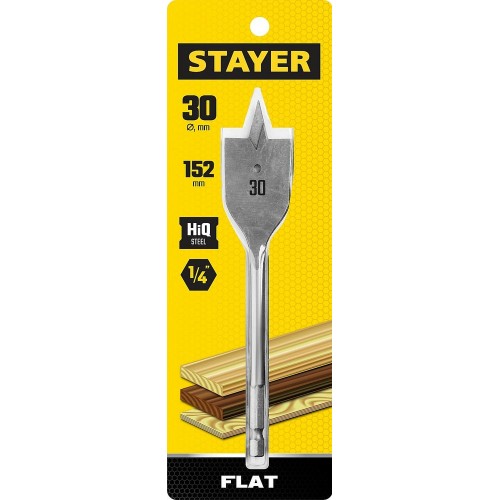 Сверло по дереву перовое STAYER 2950-30_z01, предназначено для работы с древесиной, а также легкими строительными материалами, такими как гипсокартон. Шестигранный хвостовик с проточкой, диаметр сверла - 30 мм.