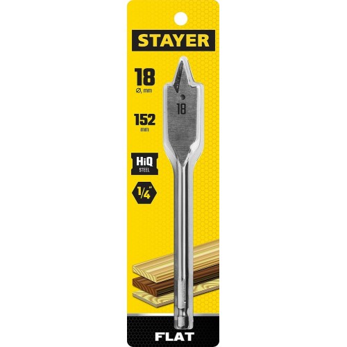 Сверло по дереву перовое STAYER 2950-18_z01, предназначено для работы с древесиной, а также легкими строительными материалами, такими как гипсокартон. Шестигранный хвостовик с проточкой, диаметр сверла - 18 мм.