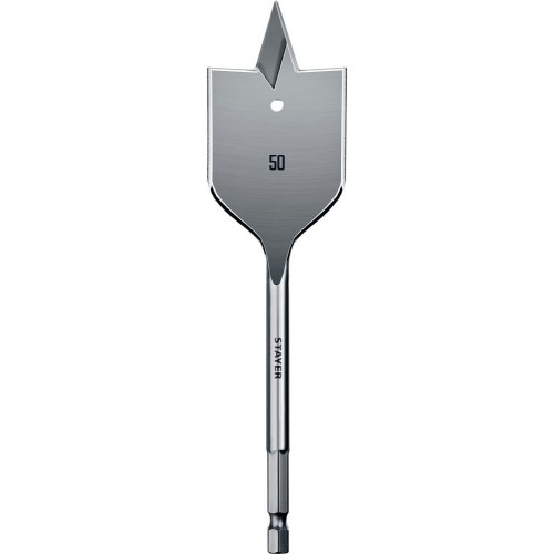 Сверло по дереву перовое STAYER 2950-50_z01, предназначено для работы с древесиной, а также легкими строительными материалами, такими как гипсокартон. Шестигранный хвостовик с проточкой, диаметр сверла - 50 мм.