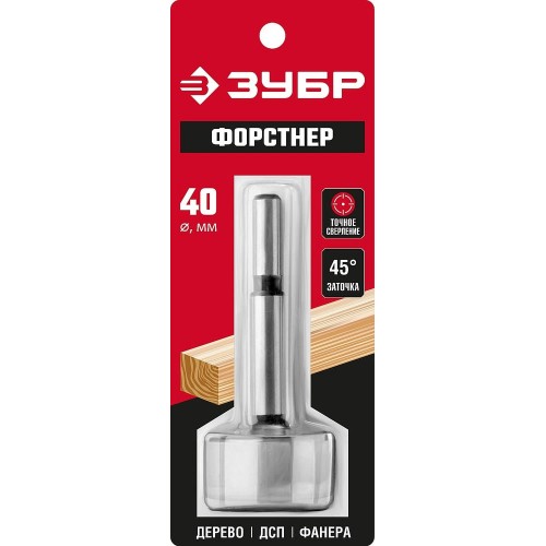 Сверло Форстнера по дереву ЗУБР 2993-40_z01, применяется при установке мебельной фурнитуры, а также при сверлении глухих отверстий с точной геометрией и плоским дном. Использование высококачественных материалов и самых современных методов изготовления позволяют получать точные и ровные отверстия в древесине, фанере, ДСП, клееных щитах и пластмассе.