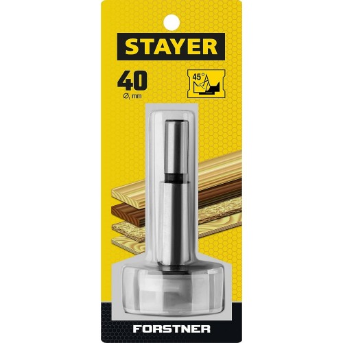 Сверло Форстнера по дереву STAYER 29985-40_z01, применяется при установке мебельной фурнитуры, а также при сверлении глухих отверстий с точной геометрией и плоским дном.