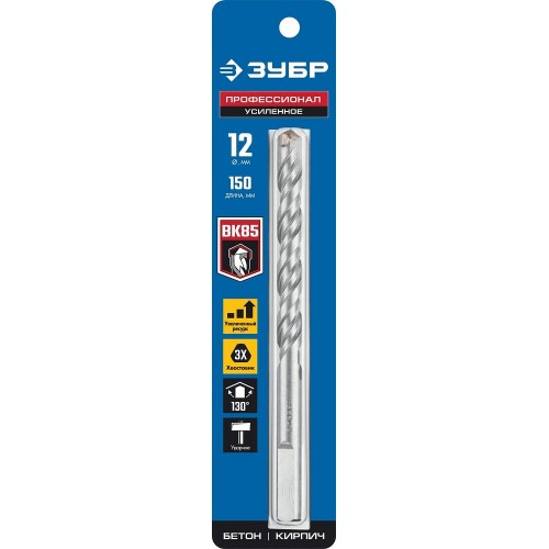 Сверло по бетону Зубр 2916-150-12_z01, предназначено для работ по бетону, граниту, природному и искусственному камню, кирпичной кладке. Используются с дрелями и перфораторами в режиме сверления с ударом. Усиленная пластина из твердого сплава ВК85 существенно увеличивает скорость сверления, а также повышает износостойкость сверла в процессе эксплуатации. Усиленный стальной стержень защищает сверло от деформации при ударных нагрузках. Фрезерованная спираль 4-С обеспечивает повышенную стойкость сверла к излому и эффективно подавляет вибрацию в процессе сверления. Трехгранный хвостовик не допускает проворачивания сверла в сверлильном патроне.