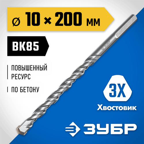 ЗУБР 10 x 200 мм, 3-х гранный хвостовик, сверло по бетону усиленное 2916-200-10_z01 ПРОФЕССИОНАЛ