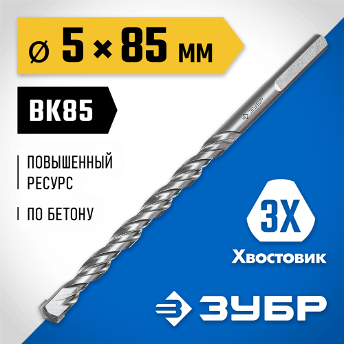 Сверло по бетону Зубр 2916-085-05_z01, предназначено для работ по бетону, граниту, природному и искусственному камню, кирпичной кладке. Усиленная пластина из твердого сплава ВК85 существенно увеличивает скорость сверления, а также повышает износостойкость сверла в процессе эксплуатации. Усиленный стальной стержень защищает сверло от деформации при ударных нагрузках. Фрезерованная спираль 4-С обеспечивает повышенную стойкость сверла к излому и эффективно подавляет вибрацию в процессе сверления. Трехгранный хвостовик не допускает проворачивания сверла в сверлильном патроне.