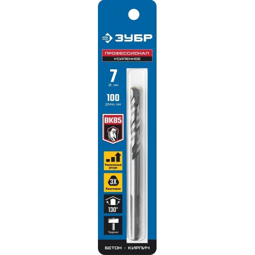 Сверло по бетону Зубр 2916-100-07_z01, предназначено для работ по бетону, граниту, природному и искусственному камню, кирпичной кладке. Сверло изготовлено из высокопрочной легированной стали, пайка пластины из твердосплава ВК85 выполнена жаростойким припоем на основе меди. Сверло имеет продолжительный рабочий ресурс и высокую скорость сверления.