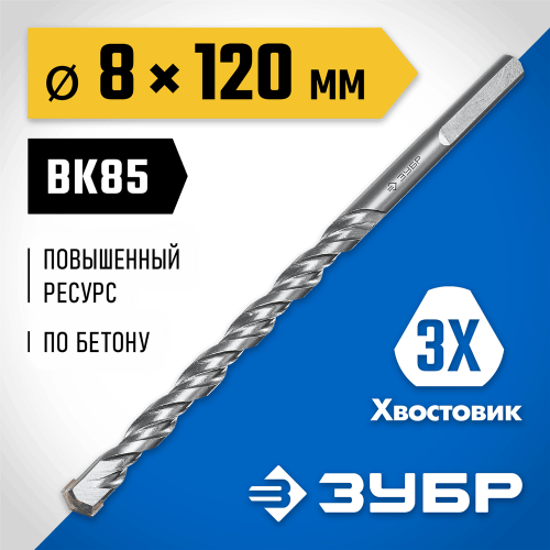 Сверло по бетону Зубр 2916-120-08_z01, предназначено для работ по бетону, граниту, природному и искусственному камню, кирпичной кладке. Диаметр сверла: 8 мм. Длина сверла: 120 мм. Тип наконечника: классический двухрезцовый. Материал наконечника: твердый сплав ВК85. Хвостовик: трехгранный.