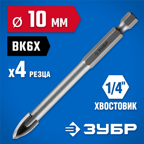 Сверло по кафелю и стеклу 10 мм ЗУБР 29845-10_z01, применяется для сверления отверстий в стекле, керамической и кафельной плитке, мраморе. Четыре резца. Благодаря четырём режущим лезвиям сверление осуществляется в два раза эффективней. Наконечник сверла из твердого сплава BK6Х. Специальная заточка режущих кромок улучшает прохождение материала. Шестигранный хвостовик для предотвращения проворачивания в сверлильном патроне. Специальная проточка хвостовика 1/4" для использования быстросъемных адаптеров.