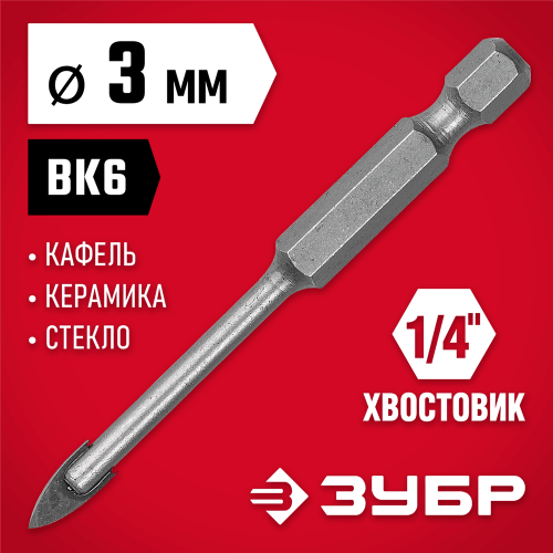 ЗУБР 3 мм, 2-х резцовый, шестигранный хвостовик, сверло по стеклу и кафелю 29840-03