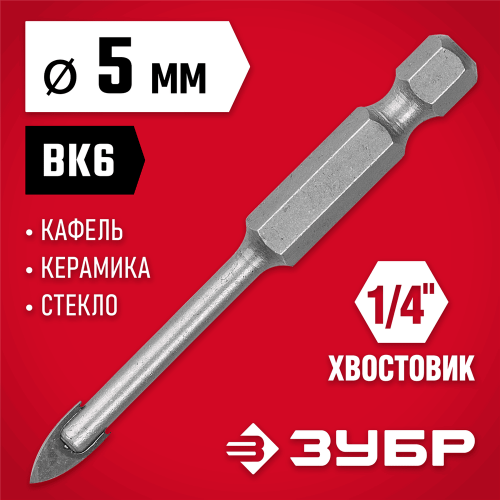 ЗУБР 5 мм, 2-х резцовый, шестигранный хвостовик, сверло по стеклу и кафелю 29840-05