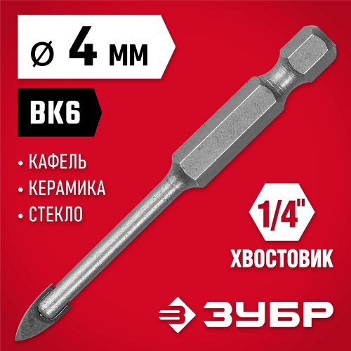 Сверло по кафелю и стеклу 4 мм ЗУБР 29840-04, предназначено для сверления отверстий в стекле, керамической и кафельной плитке. Наконечник сверла из твердого сплава BK6. Специальная заточка режущих кромок улучшает прохождение материала. Шестигранный хвостовик для предотвращения проворачивания в сверлильном патроне. Специальная проточка хвостовика 1/4" для использования быстросъемных адаптеров.