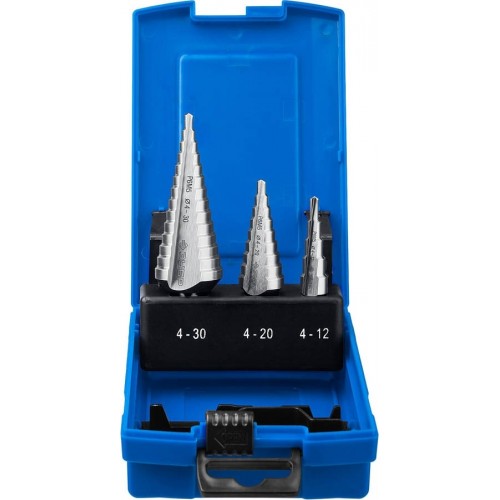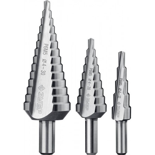Ступенчатое сверло по металлу набор ЗУБР 29670-4-30-H3_z01, предназначено для сверления листового металла толщиной до 4 мм, цветных металлов, пластмасс и других материалов. Сверло изготовлено методом шлифования профиля по ГОСТ 10902-77 и соответствует классу точности сверления "А1". Угол заточки при вершине равный 135°, оснащенный крестообразной подточкой, позволяет сверлить тугоплавкие металлы и сплавы без предварительного кернения.