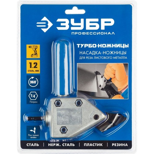 Насадка-ножницы "Турбо-Ножницы" ЗУБР 23292, предназначена для профессионального точного, быстрого и чистого реза листового металла.