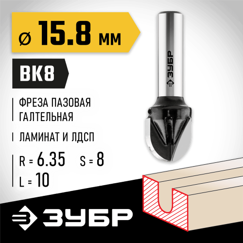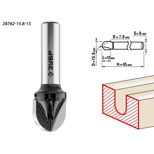 Фреза пазовая галтельная ЗУБР 28782-15.8-13, предназначена для профилирования кромок, изготовления декоративных пазов и рисунков, фрезерования канавок при работе с различными видами древесины.