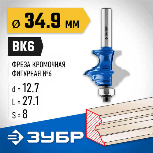 Фреза кромочная фигурная №6(многопрофильная) ЗУБР 28717-34.9, предназначена для изготовления фигурных кромок и торцев деталей при обработке различных видов древесины. Высококачественный твердый сплав для повышенного ресурса и чистоты обработки. Заточка производится только на самых современных станках с ЧПУ. Упорный подшипник позволяет обрабатывать криволинейные кромки без дополнительных приспособлений.