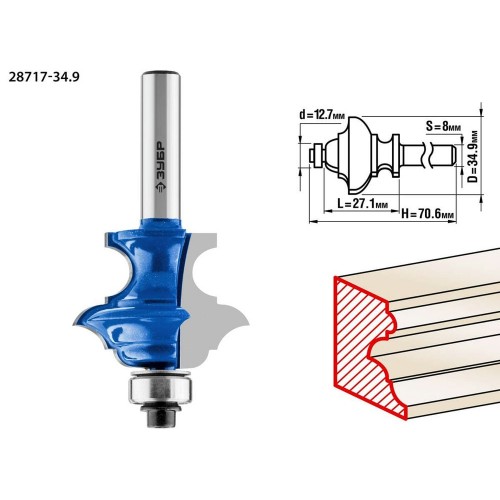 Возможно использование отдельных частей фрезы для получения декоративного профиля. Используется на фрезерных станках и ручных фрезерах при обработке мебели, столярных изделий, предметов интерьера, а также реставрационных работах. Рекомендуется для применениях на станках мощностью более 1,6 кВт