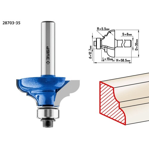 Фреза кромочная калевочная ЗУБР 28703-35, предназначена для скругления кромок при обработке столешниц, полок, шкафов и прочих работ с разнообразными видами древесины. Высококачественный твердый сплав для повышенного ресурса и чистоты обработки. Заточка производится только на самых современных станках с ЧПУ. Упорный подшипник позволяет обрабатывать криволинейные кромки без дополнительных приспособлений.