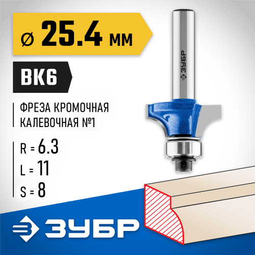 ЗУБР 25.4 x 11 мм, радиус 6.3 мм, фреза кромочная калевочная №1 28701-25.4 Профессионал