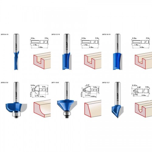 Набор фрез отлично подходит для профилирования кромок, изготовления декоративных пазов и рисунков, фрезерования канавок при работе с различными видами древесины.