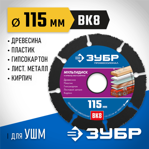Диск для УШМ по древесине ЗУБР 36859-115_z01, предназначен для грубых, быстрых распилов твердой и мягкой древесины, древесины с гвоздями и остатками цемента, фанеры, пластика, тонколистового и цветного металла, алюминиевого профиля, кирпича, а также гипсокартона.