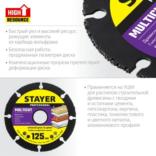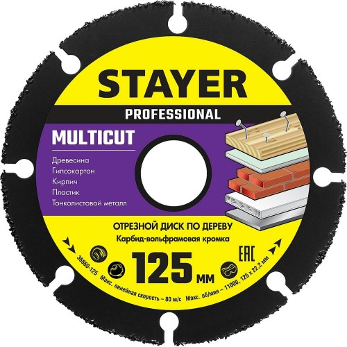 Отрезной диск для УШМ STAYER 36860-125, предназначен для грубых, быстрых распилов твердой и мягкой древесины, древесины с гвоздями и остатками цемента, фанеры, пластика, тонколистового и цветного металла, алюминиевого профиля, кирпича, а также гипсокартона.
