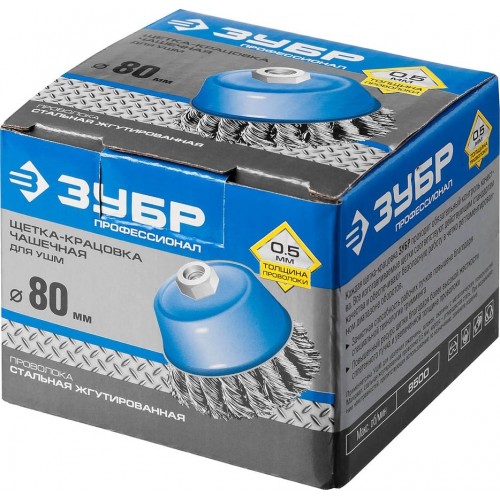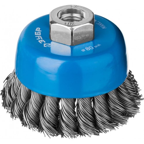 Щетка чашечная для УШМ ЗУБР 35275-080_z02, предназначена для зачистки поверхностей от лакокрасочных покрытий, ржавчины, окалины, различных стойких загрязнений, а также для зачистки сварных швов. Каждая щетка-крацовка ЗУБР проходит обязательный контроль качества. Все изготавливаемые щетки соответствуют действующим стандартам качества и обеспечивают безопасную работу в четко регламентированном диапазоне оборотов. Стальная жгутированная проволока. Повышенный ресурс щетки благодаря еще более высокой жесткости сплетенного пучка и увеличенной толщине проволоки.