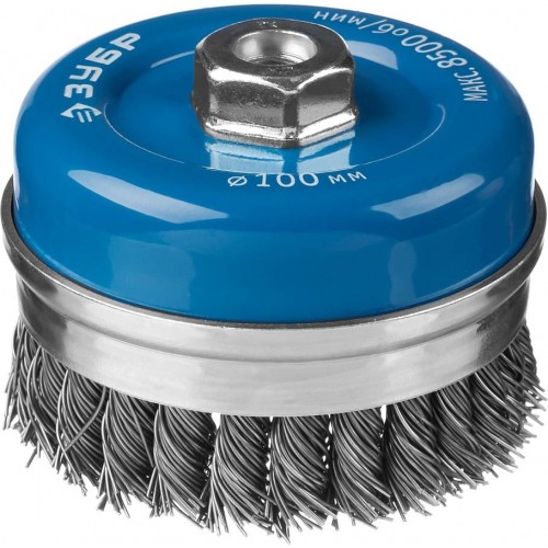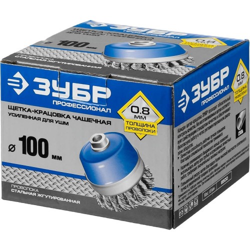 Щетка крацовка чашечная для УШМ ЗУБР 35271-100_z02, предназначена для удаления ржавчины, шлаков, окалины с металлических поверхностей. Идеально подходит для обработки сварных швов, отливок из чугуна, стали и цветных металлов. Максимальная частота вращения - 6500 об/мин. Изготовлена из жгутированной стальной проволоки, обеспечивающей максимально-чистую обработку поверхности. Наличие усиливающего бандажного кольца позволяет использовать щетку для работ, требующих значительных силовых нагрузок. Щетка крацовка прошла обязательный контроль качества, соответствует действующим стандартам качества и обеспечивает безопасную работу в четко регламентированном диапазоне оборотов.