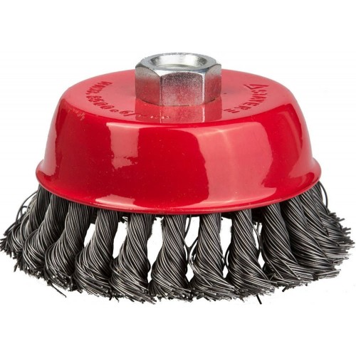 Щетка крацовка чашечная для УШМ STAYER 35128-100_z01, предназначена для зачистки поверхностей от лакокрасочных покрытий, ржавчины, окалины и различных загрязнений с поверхностей изделий из стали и цветных металлов. Щетка изготовлена из латунированной витой проволоки. Латунированное покрытие защищает рабочую часть щетки от коррозии. Витая форма проволоки позволяет обрабатывать поверхности без повреждений. Каждая щетка крацовка STAYER соответствует действующим стандартам качества и обеспечивает безопасную работу в указанном диапазоне оборотов.