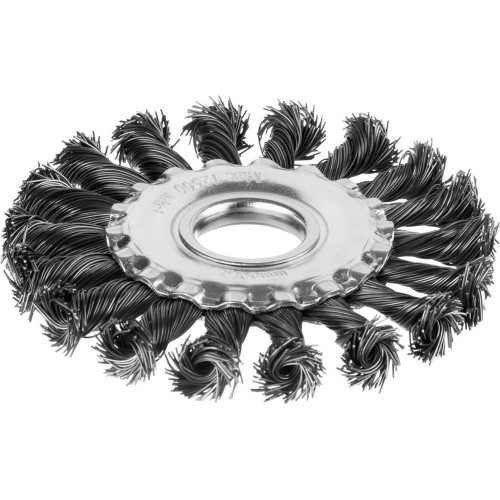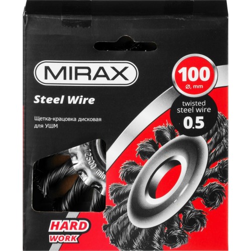 Щетка крацовка дисковая для УШМ MIRAX 35140-100, предназначена для зачистки поверхностей от лакокрасочных покрытий, ржавчины, окалины, различных загрязнений с применением значительных усилий, а также для зачистки сварных швов. Стальная жгутированная проволока. Благодаря еще более высокой жесткости сплетенного пучка и увеличенной толщине проволоки щетка обладает повышенным ресурсом.