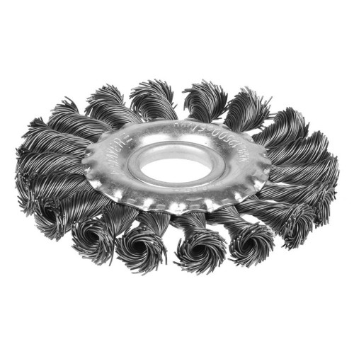 Щетка крацовка дисковая для УШМ STAYER 35120-100, предназначена для зачистки поверхностей в труднодоступных местах от лакокрасочных покрытий, ржавчины, окалины, различных загрязнений с применением значительных усилий, а также для зачистки сварных швов. Щетка изготовлена из стальной жгутированной проволоки. Благодаря еще более высокой жесткости сплетенного пучка и увеличенной толщине проволоки щетка обладает повышенным ресурсом.