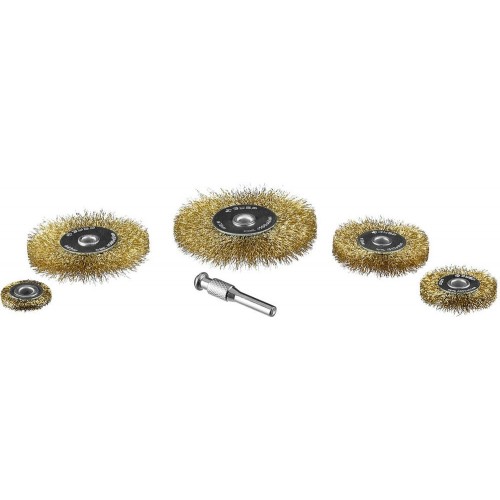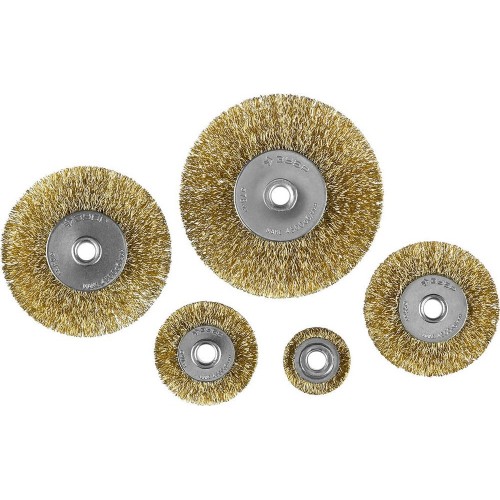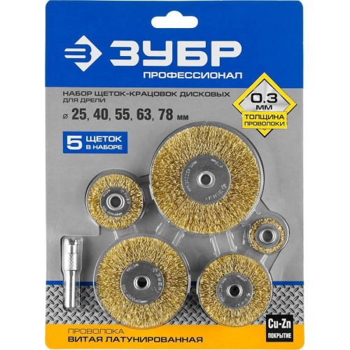 Набор щеток дисковых для дрели ЗУБР 3521-H5_z02, предназначен для удаления застарелых лакокрасочных покрытий, въевшейся грязи, ржавчины, окалины с поверхностей изделий из стали и цветных металлов. Витая стальная латунированная проволока. Латунированное покрытие защищает рабочую часть щетки от коррозии. Каждая щетка-крацовка ЗУБР проходит обязательный контроль качества. Все изготавливаемые щетки соответствуют действующим стандартам качества и обеспечивают безопасную работу в четко регламентированном диапазоне оборотов.