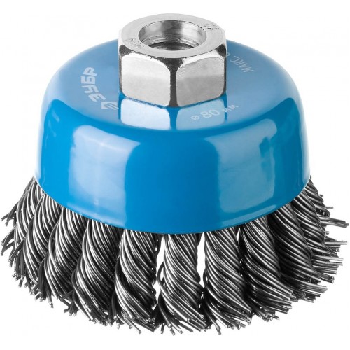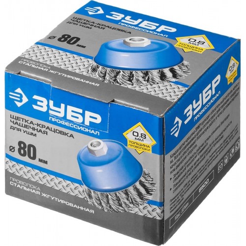 Щетка чашечная для УШМ ЗУБР 35277-080_z02, предназначена для зачистки поверхностей от лакокрасочных покрытий, ржавчины, окалины, различных стойких загрязнений, а также для зачистки сварных швов. Каждая щетка-крацовка ЗУБР проходит обязательный контроль качества. Все изготавливаемые щетки соответствуют действующим стандартам качества и обеспечивают безопасную работу в четко регламентированном диапазоне оборотов. Стальная жгутированная проволока. Повышенный ресурс щетки благодаря еще более высокой жесткости сплетенного пучка и увеличенной толщине проволоки.