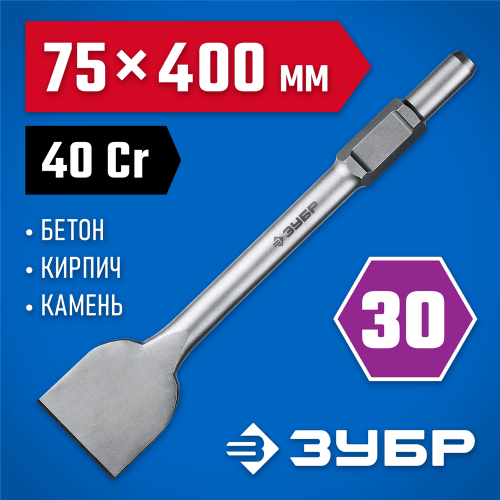 Зубило лопаточное 75 х 400 мм, HEX 30, ЗУБР 29375-75-400, предназначено для демонтажных работ на асфальтовом покрытии, в бетоне и кирпичной кладке. Используется с ударными перфораторами с системой крепления НЕХ 28 мм. Индукционная трехступенчатая закалка со строгим соблюдением температур в каждой зоне при термообработке для повышения стойкости и увеличения рабочего ресурса инструмента. Высокопрочная легированная сталь гарантирует продолжительный срок службы инструмента. Высокая устойчивость по отношению к ударам и динамическим нагрузкам. Шлифованная круглая форма. Износостойкое покрытие, защищающее от коррозии.