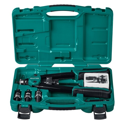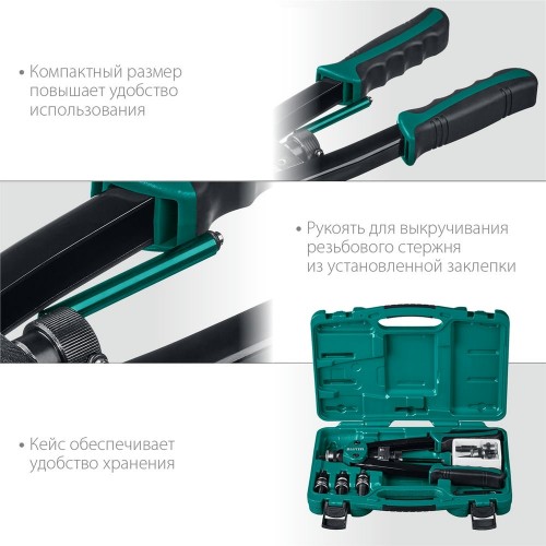 Заклепочник KRAFTOOL 31183, предназначен для установки резьбовых заклепок из алюминия, стали и нержавеющей стали. Рычажная конструкция инструмента многократно увеличивает приложенные усилия. Компактный размер повышает удобство использования. Кейс обеспечивает удобство хранения. Применяется для создания неразъемных соединений из различных материалов.