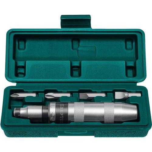 Ударно-поворотная отвертка KRAFTOOL 25555, предназначена для монтажа и демонтажа резьбовых соединений. Усиленная металлическая рукоятка с противоскользящим рифлением для тяжелых работ промасленными руками. Реверс позволяет как откручивать, так и закручивать крепеж. Работа как с ударными битами с хвостовиком 5/16”, так и с ударными головками с присоединительным квадратом 1/2”.