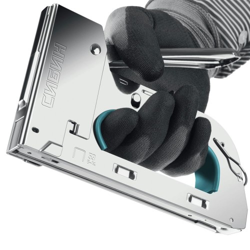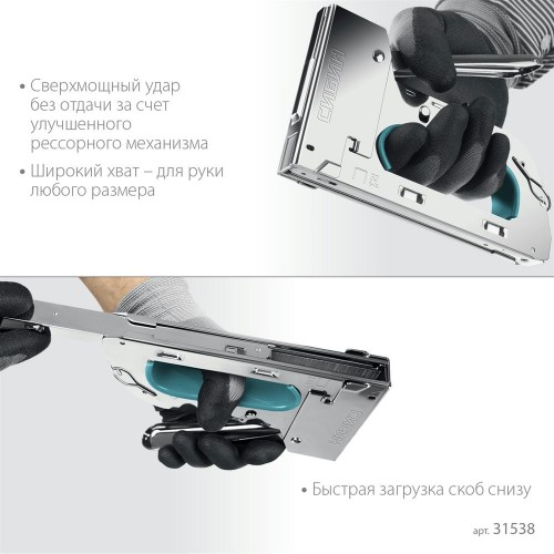 Степлер с ударным механизмом рессорного типа, увеличенная мощность, удар без отдачи.