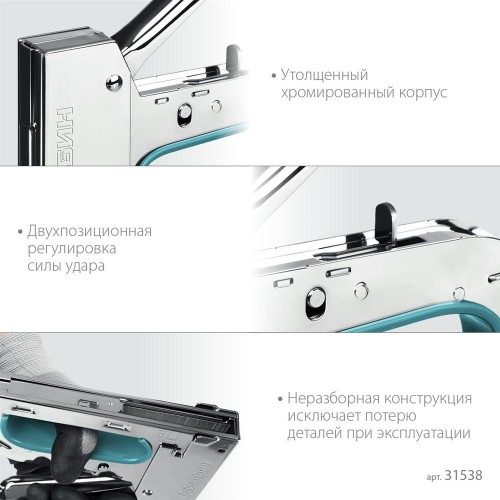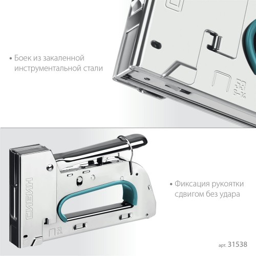 Степлер стальной СИБИН 31538, предназначен для крепления различных материалов с помощью скоб. Металлический усиленный корпус. Регулировка силы удара. Боек из закаленной инструментальной стали. Резиновая вставка снижает отдачу при работе. Система фиксации рукоятки. Надежный степлер для быстрой и качественной работы.