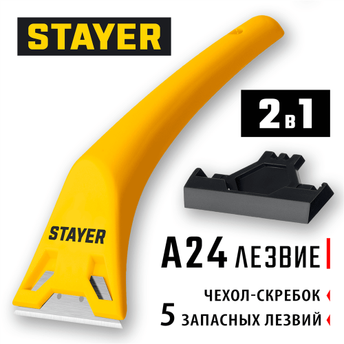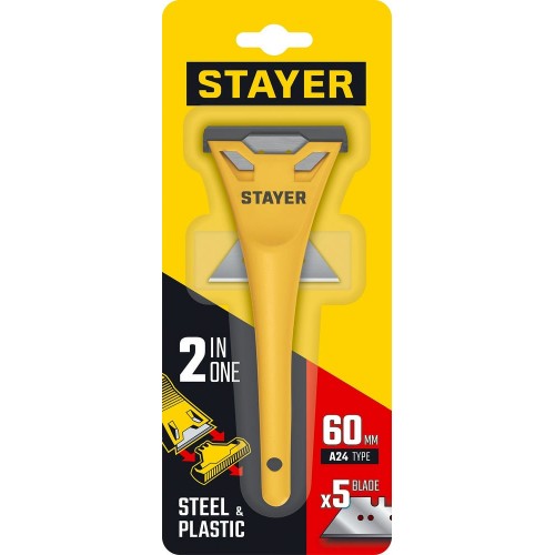 Скребок компактный STAYER 0851-H6_z02, предназначен для очистки гладких поверхностей из кафеля, стекла, керамики от различных загрязнений. Компактный пластиковый корпус. Дополнительный комплект 5 лезвий.