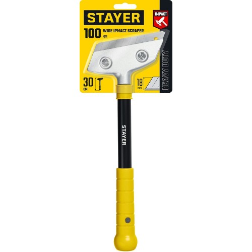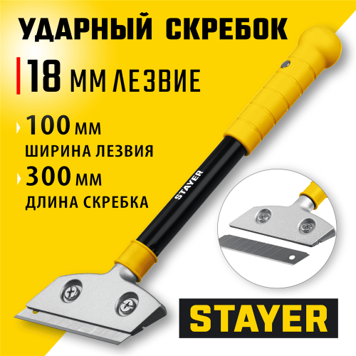 Ударный скребок STAYER 08504, предназначен для очистки гладких поверхностей из кафеля, стекла, керамики от различных загрязнений. Особопрочный металлический затыльник для ударных работ. Надежный металлический корпус. Возможно использование сегментированных лезвий 18 мм.