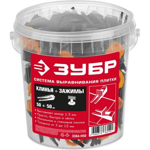 Система выранивания плитки (клин+зажим) ЗУБР 3384-H50, предназначена для выкладывания плитки на полу и стенах. Рассчитана на работу с плиткой толщиной от 3 до 12 мм и подходит для укладки плитки как на пол, так и на стены. Использование СВП существенно упрощает процесс укладки плитки и керамогранита и с этим справится даже человек, впервые столкнувшийся с ремонтом. Купив СВП вы избежите кривых швов, скопления грязи в швах, получения травм на неровно уложенной плитке и прочих неприятностей. А в итоге вы получите идеально ровную поверхность.