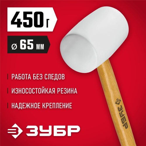 Киянка Зубр 20511-450_z02, , с резиновым бойком предназначена для бережной работы без следов на материалах со светлой поверхностью. Натуральная износостойкая резина - не подвержена раскалыванию, выкрашиванию, растрескиванию. Прочное соединение головы к рукоятке стальным штифтом.