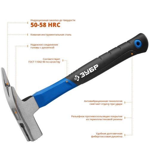 Молоток ЗУБР ПРОФЕССИОНАЛ оснащен особопрочной фибергласовой рукояткой. АВТ - технология позволяет существенно снизить вибрации, возникающие во время удара, что делает работу с инструментом более комфортной. Соответствует требованиям ГОСТ 11042-90.