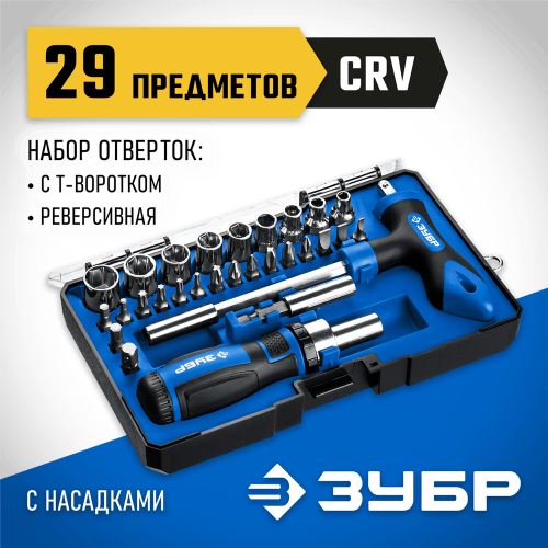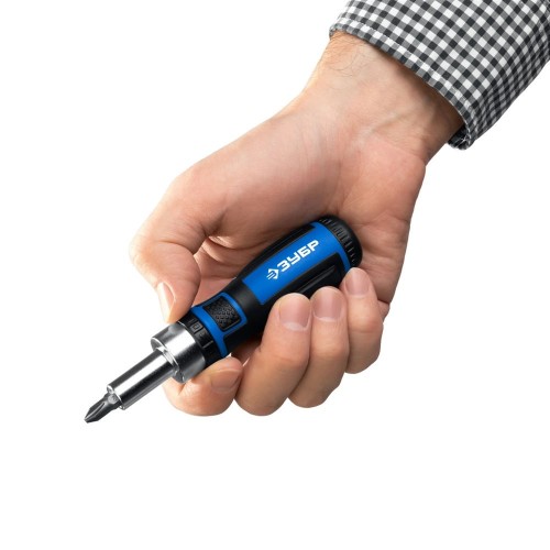 Отвертка реверсивная с насадками ЗУБР 25168-H29_z01, предназначена для монтажа и демонтажа резьбовых соединений. Эргономичная двухкомпонентная рукоятка обеспечивает надежный и комфортный захват. Отвертка оснащена реверсивным храповым механизмом. Направление вращения меняется одной рукой. Биты из Cr-Mo стали обладают повышенной прочностью и долговечностью. Торцевые головки из высококачественной углеродистой стали.