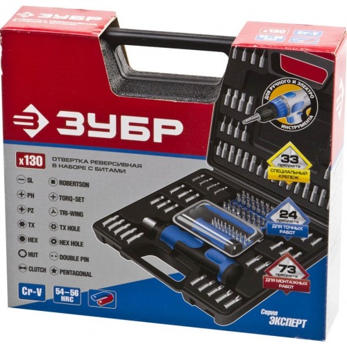 Набор инструментов ЗУБР 25237-H129, предназначен для монтажа и демонтажа резьбовых соединений для электро- и ручного инструмента. Эргономичная специально сконструированная противоскользящая двухкомпонентная рукоятка оптимальной формы обеспечивает передачу высокого крутящего момента от руки к профилю крепежа, быстрое и комфортное выполнение работ. Биты из хромованадиевой стали. Специальная закалка по особой технологии. Магнитный держатель обеспечивает быструю и надежную замену насадок.