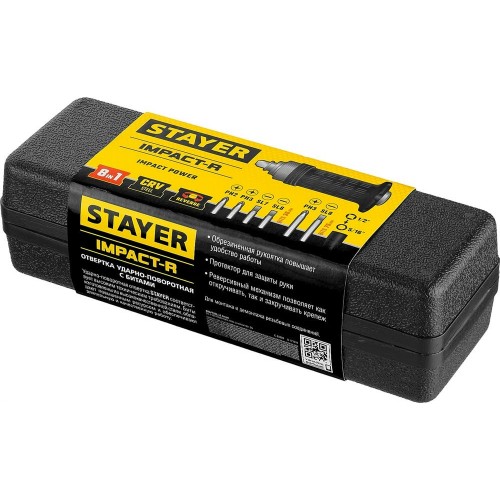 Ударно-поворотная отвертка STAYER 2566-H4_z01, предназначена для монтажа и демонтажа резьбовых соединений. Отвертка STAYER 2566-H4_z01, предназначена для монтажа и демонтажа резьбовых соединений. Ударно-поворотная отвёртка Stayer соответствует высоким техническим требованиям. Позволяет легко открутить прикипевший крепеж. Протектор для защиты руки. Биты изготовлены из высококачественной стали.