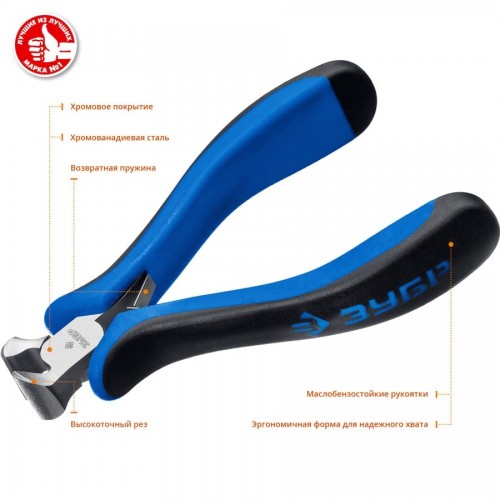 Кусачки торцевые ЗУБР 22170-7_z01, предназначены для выполнения работ в электронике и точной механике. Специальная инструментальная сталь, для оптимального баланса твердости и прочности. Поверхность губок закалена токами высокой частоты для увеличения ресурса. Хромированное покрытие защищает от механических повреждений и коррозии. Эргономичные двухкомпонентные противоскользящие рукоятки создают максимальное удобство при работе.