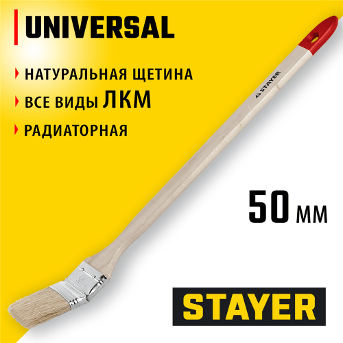 Кисть радиаторная STAYER 0112-50_z01, предназначена для нанесения всех видов лакокрасочных материалов в труднодоступных местах. Перед использованием и после окончания работ промойте кисть в растворителе. При работе используйте средства индивидуальной защиты. Натуральная щетина обеспечит оптимальное нанесение различных видов ЛКМ в труднодоступных местах, щетина кисти надежно закреплена бандажом из никилированной стали, а наличие удобной деревянной рукоятки обеспечит комфортную работу.