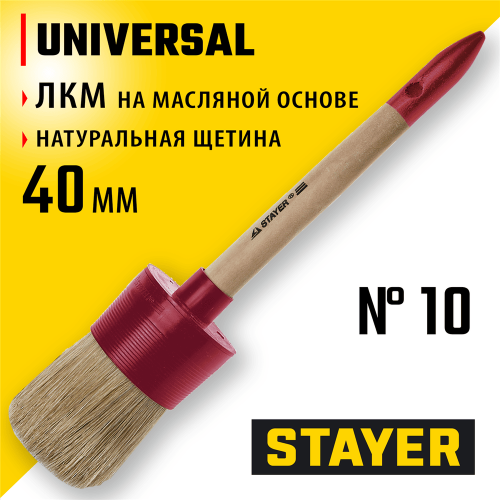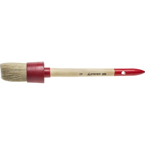 Кисть круглая малярная STAYER 0141-40, предназначена для работ со всеми видами лакокрасочных материалов, в первую очередь с масляными красками и эмалями. Светлая натуральная щетина. Деревянная ручка с отверстием для подвески. Пластмассовый бандаж.